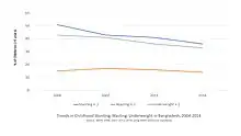 The World Bank estimates that Bangladesh is ranked 1st in the world of the number of children suffering from malnutrition.[43][42] In Bangladesh, 26% of the population are undernourished[44] and 46% of the children suffers from moderate to severe underweight problem.[45] 43% of children under 5 years old are stunted. One in five preschool age children are vitamin A deficient and one in two are anaemic.[46] Women also suffer most from malnutrition. To provide their family with food they pass on quality food which are essential for their nutrition.[47]