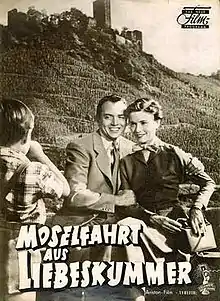 Heartbroken on the Moselle (German: Moselfahrt aus Liebeskummer) is a 1953 West German romantic comedy film directed by Kurt Hoffmann and starring Will Quadflieg, Elisabeth Müller, and Oliver Grimm. It was based on a 1932 novella by Rudolf G. Binding.[1] It was shot at the Bavaria Studios in Munich with outdoor film taking place in Bayreuth in Bavaria and at various locations in the Rhineland. The film's sets were designed by the art director Rudi Remp.