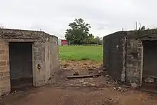 Each emplacement had an entrance corridor on one side, leading into the gun pit of the emplacement; a central group of bolts for securing the gun's hexagonal metal base plate to the concrete; and surrounding lockers in the walls of the gun pit, for "ready" ammunition, fuses etc.[42] Photographs of the Lytton gun station, taken in November 1943, show doors on each of the ammunition lockers in the gun emplacements; and pairs of cinder block walls within the entrance corridor to each emplacement - protecting the gunners from any bomb splinters from that direction.[43][1]