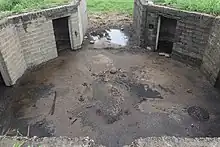 After the war, Brisbane's defences were dismantled. By 1963, the Lytton gun station's accommodation huts had been removed, although the gun emplacements, command post and two reserve magazines remained. That year several fuel tanks, part of a new Ampol refinery, were already under construction, to the north of the gun station. The defence reserve was not transferred from the Commonwealth to Ampol until 1964.[55][56] The southwestern reserve magazine and the house which had been used as an officer's mess were removed in the 1960s; the northern reserve magazine and the earth revetment on the west side of the northernmost gun emplacement were removed in the 1970s.[57] In 1990, Fort Lytton was declared a Historic National Park, after being relinquished by Ampol. The remaining refinery land, including the former GS 385, later became a Caltex refinery. In 1999, the National Park was extended to include part of the former quarantine station.[27][58] Photographs from inside the command post, taken in 2000, show caricatures of an Australian officer and a Japanese soldier, drawn on the walls. In 2019, the grassed site of GS 385 is fenced off, within the refinery.[1]
