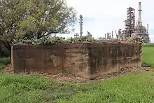 Northern gun emplacement, west side of gun pit, where earth revetment has been removed, with the refinery in the background, 2019
