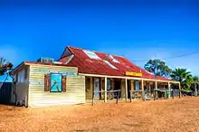 The front of the Hebel Hotel featured brightly-coloured art work by John Murray, which the interior furnishings are made of recycled items found in the bush.[13]