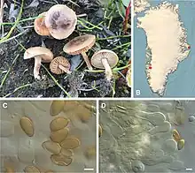 | H. louiseae A SAE-2017.125 B distribution of cited collections C spores ×1600 and D cheilocystidia ×1000 in Melzer's reagent. Scale bars: 5 µm | |
