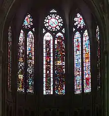 There were many reconstruction projects in Picardy in the aftermath of World War II. From 1951 de Pétigny began to accept commissions from the Monuments Historiques.[2] He was asked to create replacement stained glass windows for the Basilica of Saint-Quentin, which had been badly damaged during World War I (1914–18).[3] From 1954 Hector de Pétigny created 16 stained glass windows for the choir of the basilica in the upper levels of nine bays, each almost 14 metres (46 ft) high. He also created the stained glass of seven medallions of almost 2 metres (6 ft 7 in) in diameter, mounted above the windows.[4] He made stations of the cross in churches in Vorges, Coucy-le-Château and Marle, and made wooden decorations for the departmental archives in Laon.[2]