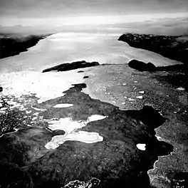 The Heilprin Glacier discharges from the Greenland Ice Sheet into the head of the Inglefield Fjord just east of the Harvard Islands and northeast of Quajaqqisaarsuaq. Its terminus lies between the Smithson Range nunatak that separates it from the Tracy Glacier to the north, and Nunatarsuaq, a plateau dotted with lakes to the south.[2] Both neighboring glaciers drain roughly 12,000 km2 (4,600 sq mi) of the Greenland Ice Sheet.[1]