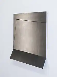 Heiner Thiel works with a variety of sculptural materials. In the 1970s he was fascinated by bronze casting, but in the 1980s he began to experiment with steel sheets, which he pretreated in a complex painting process.[2] He then formed these steel sheets into abstract wall reliefs. Depending on the angle of view, one seems to see a different object, parts of the relief appear in the foreground or disappear, bring out the illusions of perception and thus invite reflection on the theme of perspective.