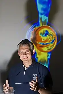 Heino Falcke (Cologne, 26 September 1966) is a German professor of radio astronomy and astroparticle physics at the Radboud University Nijmegen (Netherlands).[1] His main field of study is black holes, and he is the originator of the concept of the 'black hole shadow'.[2] In 2019, Falcke announced the first Event Horizon Telescope results at the EHT Press Conference in Brussels.[3]