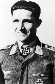 On 2 August 1942, I. Gruppe was ordered to Kerch on the Kerch Peninsula. At the time, the Gruppe was moved around as a kind of fire brigade, deployed in areas where the Soviet Air Forces was particular active.[34] The Gruppe then moved to Oryol on 15 August.[35] On 23 August, Ahnert engaged Pe-2 twin-engine bombers in combat over Koptevo, approximately 50 kilometers (31 miles) northeast of Oryol. His Bf 109 G-2 (Werknummer 13508—factory number) "Yellow 9" was hit by return fire from the bomber gunners and he was killed in action.[36][35][37] Ahnert was posthumously awarded the Knight's Cross of the Iron Cross (Ritterkreuz des Eisernen Kreuzes) that day.[38][39]