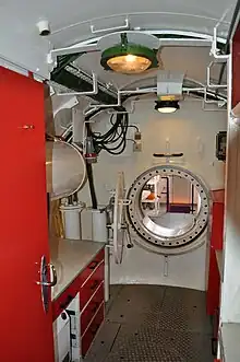 The interior of the UWL Helgoland consists of a living area 2.5 m long, an instrumentation and engine room 6.5 m long and since 1973 a wet laboratory 4 m long.[10] With a diameter of 2.5 m, this provided a useful area of 32.5 m2. The laboratory provided all necessary facilities for a stay of several weeks on the seabed. The internal pressure was the same as the external pressure, and decompression from saturation was done at the end of the mission.