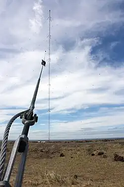 The mast, which is among the tallest structures in Western Europe, is insulated against the ground, and guyed at five levels by steel ropes, which are subdivided by insulators. It was built in 1963 to replace the 190.5 m (625 ft) tall LORAN-C mast, constructed in 1959 for the North Atlantic LORAN-C chain (GRD 7970).[2] A second, smaller, 30 m (98 ft) tall tower was installed by the US Coast Guard in the autumn of 1961 as part of a LORAN-A network paired with Greenland.