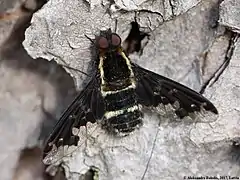 Hemipenthes maura can reach a body length of about 6–12 mm (0.24–0.47 in).[5] Body coloration is matt black, with black dusting. The spherical head is characterized by a very short snout, not much longer than the mouth. In addition to black scales along the back edge of the compound eyes, golden yellow scales appear in front of the forehead and face. The antennae have an asymmetrically onion-shaped third segment. Behind the head there is a rim of black hair, with golden yellow in the upper part. On the sides of the top of the torso, there are a pair of white or yellowish stripes. The midsection and the shield have long bristles on the edges. These insects can be distinguished from similar species by their wing venation. First of all, Hemipenthes morio, in which the tip of the R1 radial cell is transparent. [5]The wing scales are brownish-white with brown hair on the edges. The wings are blackened on a larger surface is, and the darkening also includes the tops of the radial and discoidal cells. The abdomen has the rear edges of tergites with narrow white bands, except for the fifth tergite, which has a yellowish band on the back edge. [2][6]