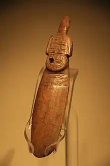 The remains of various plants, including water caltrop, Nelumbo nucifera, acorns, melon, wild kiwifruit, blackberries, peach, the foxnut or Gorgon euryale and bottle gourd, were found at Hemudu and Tianluoshan.[12] The Hemudu people likely domesticated pigs but practiced extensive hunting of deer and some wild water buffalo. Fishing was also carried out on a large scale, with a particular focus on crucian carp.[13] The practices of fishing and hunting are evidenced by the remains of bone harpoons and bows and arrowheads. Music instruments, such as bone whistles and wooden drums, were also found at Hemudu. Artifact design by Hemudu inhabitants bears many resemblances to those of Insular Southeast Asia.[14]