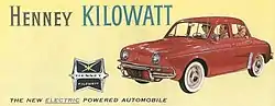 The Henney Kilowatt was an electric car introduced in the United States of America for the 1959 model year.[1] The car used some body parts as made for the Renault Dauphine. An improved model was introduced in 1960 with a top speed of 60 miles an hour and a range of 60 miles. Only 47 cars were sold over the two model years, mostly to electrical utility companies. Only a few still exist.