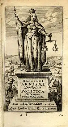 At Helmstedt, Arnisaeus became a pupil of Cornelius Martini, a Lutheran metaphysician who also influenced Hermann Conring.[4][5] He used an Aristotelian analysis to distinguish in political thought between the civitas and the res publica, in a critique of Jean Bodin, Johannes Althusius, Busius (Paulus Buis or Buys, died 1617), and Bartholomäus Keckermann.[6] He particularly criticized Bodin's strictures on mixed government in his 1606 Doctrina politica.[7] That work also incorporated Tacitean ideas, under the influence of Arnold Clapmar, within the Aristotelian and humanist framework he proposed, attacking the Ramist critics of Aristotle.[8]