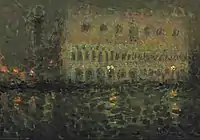 Le Sidaner held successful solo exhibitions at one of George Petit's Galleries in 1897 and at the La Libre Esthétique in Brussels in 1898. He was keen to buy a country property where he could create a garden and work in reflective solitude. It was on the advice of ceramist Auguste Delaherche that he rented a neglected property at Gerberoy in the Picardy countryside that he subsequently bought in 1904.[19] Once at Gerberoy, Le Sidaner rarely painted figures again preferring to create impressionistic moods through objects that imply human presence.[20] He also set upon the creation of a magnificent garden to rival Monet's at Giverny.[21] In 1902 Le Sidaner joined his old friend Eugène Chigot for an extended visit to Gravelines and Gisors[22] The preference for a few years was to avoid the harsh Oise winters and encamp to milder climes. In 1903 Le Sidaner spent the winter at Chartres and in 1906 in Venice where according to his biographer Mauclair he completed some of his greatest masterpieces.[2] They include a series of nocturne paintings: Le Grand Canal, Le Palais ducal, Le Palais Rouge and the vivid, mysterious La Sérénade, (1906). This series of paintings were highly acclaimed as examples of Le Sidaner's ability to capture atmospheric lighting effects, using dappled brushwork to create a sense of the luminosity of twilight.[3]