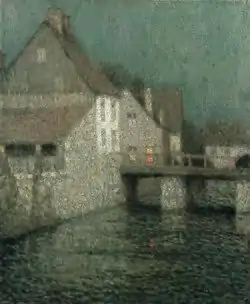 In 1895 Le Sidaner left Étaples and moved to a suburb of Paris where he became part of an artistic clique that included the musician Gabriel Fauré and the art dealer, George Petit, to whom Le Sidaner entrusted the sale of his future work. The move to Paris was likely made for career reasons. Le Sidaner much preferred a solitary existence in the French countryside. Whatever the prime reason the Paris stay was short but significant, as in 1898 he eloped to Bruges with the twenty two year old Camille Navarre, to whom he was subsequently married.[16] The success of the Belgian Les XX group of artists had positioned Bruges as a city that was responsive to new ideas and ways of thinking [17] and for Le Sidaner the years in Bruges were pivotal to his subsequent artistic career. It was in Bruges that Le Sidaner painted a series of nocturnes exploring the gloaming light around dusk. They possess a mysticism and convey the silence behind the walls and beneath the waters of Bruges' many canals.[2][note 3] La Tour, Bruges (1890) is a strong example of his Bruges period. The Tower is displayed against a sombre blue sky whose light is fading fast. The bottom of the picture is in darkness save for the favoured motif of two solitary lights through a window. In another twilight painting Crépuscule, Maisons Quai De Rosaire (1900)[18] the sombre palette is again off-set by the familiar motif of a lighted window casting its penumbra across the silent waters of the canal.