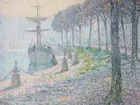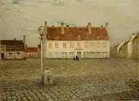 In 1883 he returned to the Côte d'Opale where he joined fellow artist Eugène Chigot at Étaples to established an artists’ workshop and regular exhibitions that would eventually develop into a school of art, called the Villa des Roses.[8] Étaples had a tradition of en plain air painting established by Charles-François Daubigny (1817–1878), who retreated there from the outbreak of the Paris Commune in 1871 and of the local Deauville painter Eugène Boudin (1824–1898), a leading post impressionist. In the late nineteenth- century numerous artists were drawn by the sand dunes, the atmospheric light and the remnants of an older France. In particular artists from the United States, Australia and the British Isles settled around Étaples in a loose collective. Most left at the outset of Great War in 1914 as Flanders became part of the Western Front.[9] Le Sidaner stayed at Étaples for twelve years preferring to work in isolation. In the meantime a febrile debate into the meaning of art was gathering apace in Paris. The Société des Artistes Indépendants was founded in 1884 whilst movements such as Pointillism with their exuberant use of colour were undermining the foundations of academicism.[10] Against this background in 1887 Le Sidaner sent his first painting to the Paris Salon followed in 1888 by La Promenade des Orphelines one of his most celebrated early works. La Benediction De La Mer exhibited in 1890 was awarded with a third place medal and a travel stipend to visit Rome where Le Sidaner made surviving copies of works by Giotto and Fra Angelico. La Benediction De La Mer is a painting with distinctly religious undertones. It is nostalgic and sentimental and the scene is set against an ethereal, atmospheric sky.[11] Le Sidaner became close friends with the Norwegian landscape artist Frits Thaulow and they travelled to The Netherlands in 1891, a visit that produced a number of paintings including Jong meisje in de duinen (Young Woman in the Dunes)(1891)[12] and Fillette au jardin (1894), an intimist painting of Thaulow's daughter unusual for the brightness of the colours that Le Sidaner choose for the little girl.[13]