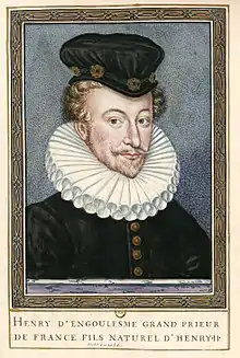 Henri was born the bastard son of Henri II of France and his mistress Janet Stewart, an illegitimate daughter of James IV of Scotland.[1] Being the most highly favored natural son of the King, he was legitimized and made Duke of Angoulême. Henri would later serve as Abbot of La Chaise-Dieu, Grand Prior of France[2] of the Sovereign Order of Malta [3] and Admiral of the Levantine Sea, further ruling as Governor of Provence from 1579 until his death in 1586.