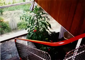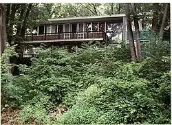 This house embodies many characteristics of the International Style, as adapted to the single-family suburban house, including an open plan with movable walls, flat roof, inclusion of modern conveniences, careful attention to environmental and functional considerations, avoidance of ornament, and extensive use of glass.[3] The house was designed to take full advantage of its unique site on the side of a hill. Connecticut has an unusually large concentration of international style houses, including the most famous, Johnson's Glass House.[2] Originally developed in Europe as a new system of building that took advantage of modern technological advances and embraced an unornamented, machine-made esthetic transcending regional or national characteristics, the International Style absorbed some natural materials and regional features in the years just before and after World War II.[3]