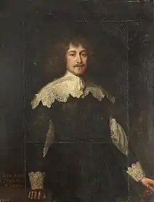 In April 1640, Jermyn was elected MP for Corfe Castle in the Short Parliament together with his brother Thomas.[2] The brothers were both elected MPs for Bury St Edmunds in the Long Parliament in November 1640 and were active and ardent Royalists. Jermyn took a prominent part in the First Army Plot of 1641 and on its discovery he fled to France.[5] In 1642, he joined Henrietta Maria in The Hague where he assisted her to raise loans, buy weapons and recruit troops for the Royalist cause. Returning to England in 1643, he resumed his personal attendance on the queen and was appointed colonel of her bodyguard. On 8 September 1643 he was raised to the peerage as Baron Jermyn of St Edmundsbury,[4] ostensibly so that, should he fall into Parliamentarian hands, he would be beheaded, and not hanged, drawn and quartered. The same year he was made a colonel of horse in the king's army. In 1644 he became the queen's chamberlain. A few months later he accompanied Henrietta Maria to France, where he continued to act as her secretary and confidant, and attempted to raise support for the Royalist war effort.[6]