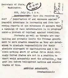 A telegram written by Morgenthau to the State Department in 1915 described the massacres of Armenians in the Ottoman Empire as a "campaign of race extermination."