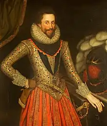 In 1598 Southampton was involved in a brawl at court with Ambrose Willoughby,[33] one of the Queen's esquires of the body, who had ordered him to leave the presence chamber where he was playing the card game primero after the Queen had retired for the evening. Southampton struck Willoughby, and "Willoughby puld of some of his locke", for which the Queen gave Willoughby thanks, saying "he had done better yf he had sent hym to the porters lodge, to see who durst have fetcht hym out".[34] There is a suggestion that underlying the altercation was something Willoughby had said which caused trouble between Southampton and his mistress, Elizabeth Vernon, one of the Queen's Maids of Honour. The Queen forbade Southampton to present himself at court, although he was soon allowed back. Nonetheless, it was reported by Rowland Whyte at the beginning of February that "My Lord of Southampton is much troubled at her Majesties straungest Usage of hym". Faced with his financial difficulties and the Queen's disfavour, Southampton determined to live abroad for a time, and seized the opportunity of accompanying Sir Robert Cecil on an embassy to Henri IV of France. On 6 February Southampton was granted licence to travel abroad for two years, and by March he and Cecil were in Angers, where on 7 March Southampton was presented to the French King.[35]