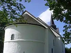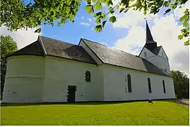 The earliest existing historical records of the church date back to the year 1432, but the church was originally constructed during the second half of the 1100s. The church has a rectangular nave, a tower to the west, and a narrower choir with a semicircular apse. The choir and apse have a lower roof line than the nave. Research on the building has shown that the choir part is the oldest part of the existing building with the apse and nave built a little later. Originally, the current choir was the stone nave that was attached to a wooden building. The wood building was later torn down and the stone building was expanded. Over the years, the church fell into disrepair. During the early 1400s, the western wall of the church was taken down and the stone nave was shortened by about 4 metres (13 ft) and then a new wall was built. In 1879, the church was enlarged by doubling the length the nave (adding about 10 metres (33 ft) to the nave) and then a new west tower was added on the end of the new nave. In the 1960s, the church was thoroughly renovated by the architect John Egil Tverdahl.[3][4]