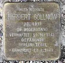 1. 1 2 3 4 5 "Herbert Gollnow". Stolpersteine in Berlin (in German). Koordinierungsstelle Stolpersteine Berlin. Retrieved 11 February 2021.