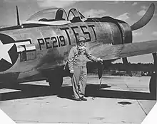 Fisher with USAAF P-47D-30-RE "Test PE-219" in postwar testing; note scimitar propeller.
