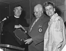 Fisher receiving the CBI Americanism Award, his wife Emily by his side, c. 1976.
