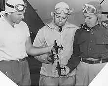 Curtiss company executives, with Fisher (at center), indicating the highly decorated P-40N,[N 5] the firm's 15,000th fighter, November 1944.