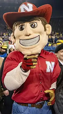 The University of Nebraska–Lincoln cycled through several official mascots before settling on Herbie Husker. The first of these was Corncob Man, a man in green overalls with an ear of corn for a head. After just a few years, the university sought a more "representative" mascot and debuted Huskie the Husker, a farmer who stood ten feet tall and wore overalls with a straw hat on top of a fiberglass head.[2] Huskie soon gave way to Mr. Big Red (more commonly known as Harry Husker); Harry was equally tall but dressed in a blazer and red wide-brim hat. Harry's head was so large it couldn't fit on the team's traveling bus, and it was so heavy the student wearing the costume had to be switched every 45 minutes.[3]