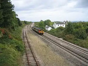 The Hereford, Ross and Gloucester Railway (also known as the Gloucester and Dean Forest Railway) was a railway which ran for 22+1⁄2 miles (36.2 km) linking Hereford and Gloucester, England, via Ross-on-Wye. It was opened on 1 June 1855 as a 7 ft 1⁄4 in (2,140 mm) broad gauge line, it was amalgamated with the Great Western Railway in 1862. In 1869 the railway was converted to 4 ft 8+1⁄2 in (1,435 mm) standard gauge.[1] The railway was closed to passengers on 2 November 1964, freight services between Ross-on-Wye railway station and Grange Court railway station continued on until 1 November 1965.[1]