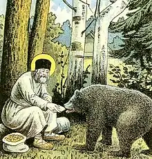 • In medieval romances, the knight-errant frequently encounters hermits on his quest. Such a figure, generally a wise old man, would advise him. Knights searching for the Holy Grail, in particular, learn from a hermit the errors they must repent for, and the significance of their encounters, dreams, and visions.[29] Evil wizards would sometimes pose as hermits, to explain their presence in the wilds, and to lure heroes into a false sense of security. In Edmund Spenser's The Faerie Queene, both occurred: the knight on a quest met a good hermit, and the sorcerer Archimago took on such a pose.[30] These hermits are sometimes also vegetarians for ascetic reasons, as suggested in a passage from Sir Thomas Malory's Le Morte d'Arthur: "Then departed Gawain and Ector as heavy (sad) as they might for their misadventure (mishap), and so rode till that they came to the rough mountain, and there they tied their horses and went on foot to the hermitage. And when they were (had) come up, they saw a poor house, and beside the chapel a little courtelage (courtyard), where Nacien the hermit gathered worts (vegetables), as he had tasted none other meat (food) of a great while."[31] The practice of vegetarianism may have also existed amongst actual medieval hermits outside of literature.