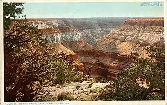 Hermit Canyon is a north-trending canyon in western Grand Canyon, about 6.0 miles in length, below the South Rim. It is named for the hermit who built Hermit Camp, at the Colorado River, Louis D. Boucher.[3] Hermit Canyon's east flank is bordered by Pima Point of the South Rim (about at the canyon midpoint), and Pima Point is ~2.0  from the Hermit Canyon midline. Pima Point is about 3.5 miles west-northwest of Grand Canyon Village, and the South Rim at Pima Point trends southward, as the start of Western Grand Canyon; it also marks the terminus of the West Rim Road.