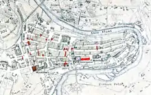 While the city of Bern was founded in 1191, what would become the Herrengasse wasn't added until a little while later. In 1255 the Franciscan friars were granted a piece of land in the southwest corner near the city wall. A year later, in 1256, a Teutonic Knights chapter house is first mentioned on the south side of the modern Münsterplatz. The road that would become the Herrengasse stretched between the two.[2] Both of the original names of the Herrengasse (vicus de Egerdon and herrengass von Egerdon) refer to a knight (or Herren, a member of the minor nobility), Heinrich von Egerdon, who bought a house along the road in November 1271.[3]