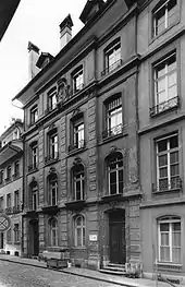 In contrast to Herrengasse 4, Herrengasse 23 dates back to the Late Middle Ages and grew out of the combination of several older houses.[8] Most of the building already existed by 1600. Between 1603 and 1607 there was a late gothic house located at what would become Herrengasse 23. In 1690 the exterior was rebuilt in an early Baroque style with a north-south running hipped roof and stair tower on the west. This renovation was done by the architect Abraham Dünz. Around 1730–1740 the building was renovated into a late Baroque style and the western stair tower was integrated into the building.[9] Shortly before his death, in 1756, Phillipp Albert von Bürens sold the house to David Salomon von Wattenwyl. Soon afterwards, the architect Erasmus Ritter, rebuilt the house for von Wattenwyl in a Louis XV style. The house may be the most important example of Ritter's work.[10] The house was known as the von Wattenwyl house, not to be confused with the Beatrice von Wattenwyl-Haus (also known as the von Wattenwyl house) at Junkerngasse 59.