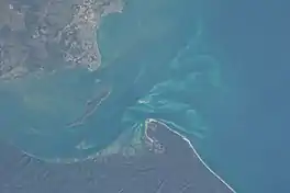 View from the International Space Station of the town of Hervey Bay (upper left), the Great Sandy Strait (left), Fraser Island (lower) and Hervey Bay (upper and right), 2013