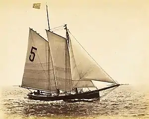 The pilot-boat Hesper, No. 5, was launched on October 4, 1884, from the Montgomery & Howard shipyard in North Chelsea, Massachusetts.[2] She was designed from a model by Dennison J. Lawlor.[3] The pilots assigned to the Hesper were: Captains George W. Lawler, James L. Smith, J. A. G. McField, Augustus Hooper, R. L. Stubbs, and R. Y. Woodbury.[4]