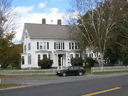 The Hewitt House is located in the village of Enfield, at the northeast corner of U.S. Route 4 and Maple Street. It is a 2½-story wood-frame structure, with a gabled roof, two interior chimneys, and clapboarded exterior. The house is three bays wide and two deep, with paired brackets in the eaves. The front facade is symmetrical about the main entrance, with paired windows in each bay on the second floor, and projecting polygonal bay windows on the ground floor. The bay window roofs and the front entry portico are covered by shallow-pitch roofs with brackets matching those in the main roof line.[3]