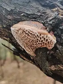 Wasp nest polypore is an irregular hoof shaped bracket fungus approximately 25–80mm in diameter. With its hexagonal and radially elongated pores it gives the fungus the appearance of a wasp nest.[3] The flesh has a hard woody texture that extends about five centimetres from the substrate with pores that change in colour from off white to dark brown depending on age.[4] The spores are smooth and cylindrical 14–17 × 5–7 micrometres.[5] The upper surface attached to the substrate can be hairy[5] and has bumps and groves that look like channels[3]