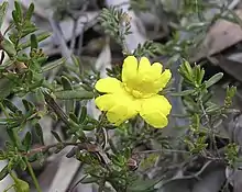 Hibbertia diamesogenos is a species of flowering plant in the family Dilleniaceae and is endemic to the south-west of Western Australia. It is a prostrate, mat-forming or ascending shrub that grows to a height of up to 60 cm (24 in). The shrub varies in its stature, leaf size and hairiness and flower size and some specimens have two or three staminodes either side of the stamens.[2]