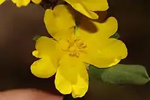 Hibbertia ovata is a species of flowering plant in the family Dilleniaceae and is endemic to Western Australia. It is an ascending or erect, spreading shrub that typically grows to a height of 10–60 cm (3.9–23.6 in). It flowers from July to November and has yellow flowers.[2] It was first formally described in 1845 by Ernst Gottlieb von Steudel in Lehmann's Plantae Preissianae.[3][4] The specific epithet (ovata) means "wider below the middle", referring to the leaves.[5]