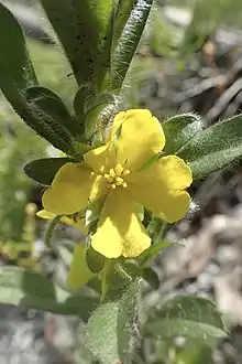 Hibbertia villosa is an erect shrub that typically grows to a height of up to 50 cm (20 in) and has its branches and leaves covered with whitish hairs up to 3 mm (0.12 in) long. The leaves are spatula-shaped to egg-shaped with the narrower end towards the base, 7–25 mm (0.28–0.98 in) long, 3–10 mm (0.12–0.39 in) wide and sessile. The flowers are arranged in leaf axils and are sessile with hairy bracts about 1.5 mm (0.059 in) long at the base. The sepals are narrow egg-shaped, 6.3–9 mm (0.25–0.35 in) long, the petals yellow, spatula-shaped, 10–23 mm (0.39–0.91 in) long and 7–10 mm (0.28–0.39 in) wide. There are usually fifteen to twenty stamens arranged in three groups around three glabrous carpels. Flowering occurs from August to November.[2][3]