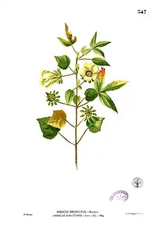 Hibiscus surattensis, the bush sorrel or wild sour, is a widespread species of flowering plant in the family Malvaceae.[2] It is native to the seasonally dry tropical (and subtropical) Old World, and has been introduced to many islands of the Indian Ocean.[1] As the common names imply, it is eaten as a leafy green by local peoples.[2]