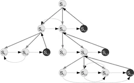 Note that a vertical transition can result in more vertical transitions before reaching a sequence of production states and finally returning to the top level. Thus the production states visited give rise to a sequence of observation symbols that is "produced" by the state at the top level.