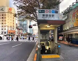 Higashi-ginza Station (東銀座駅, Higashi-ginza-eki) is a subway station on the Asakusa Line, operated by the Tokyo Metropolitan Bureau of Transportation (Toei), and on the Hibiya Line operated by Tokyo Metro. The Hibiya Line station is subtitled "Kabukiza-mae". The station is located in Ginza, Chūō, Tokyo, Japan. Its numbers are A-11 and H-10.