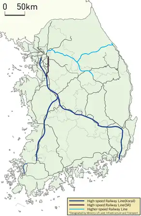 The Railway Service Act[1] is the primary Korean law that codifies and defines the three types of railway lines. It states that the Ministry of Land, Infrastructure and Transport should designate track lines and announce them before their commercial operation.[2][3] There are three types of railway lines.
