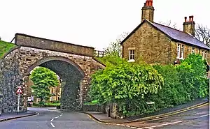 On leaving its bay at Buxton LNWR station, the line turned through a tight 180-degree curve southwards across a thirteen-arch skew viaduct 87 feet (27 m) high over the Midland line and Spring Gardens, with an uphill gradient of 1 in 62. The station was located next to Clifton Road, and between it and Dale Road was an extensive goods yard which had been opened in 1891 as part of the scheme to link Buxton with High Peak Junction near Cromford. Like all the stations on the line the platforms and buildings were of timber construction.