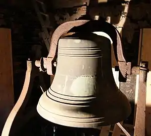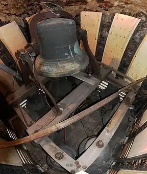 The bronze Tenor Bell in the Highland Arts Theatre Chime. This is the heaviest bell at 2,050 lb (930 kg) and is mounted in a rotary iron yoke on iron stands above the main chime frame in the bell chamber.